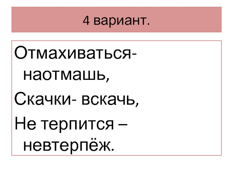 4 вариант.Отмахиваться- наотмашь,Скачки- вскачь,Не терпится –невтерпёж.