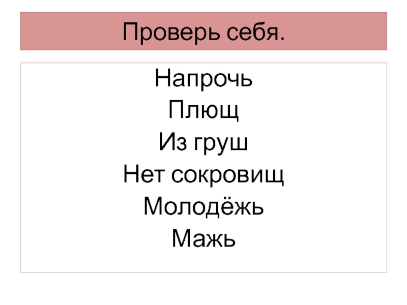 Проверь себя.НапрочьПлющИз грушНет сокровищМолодёжьМажь