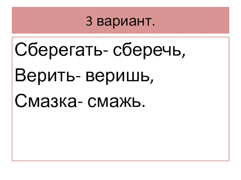 3 вариант.Сберегать- сберечь,Верить- веришь,Смазка- смажь.