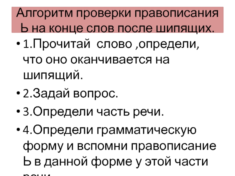 Алгоритм проверки правописания Ь на конце слов после шипящих.1.Прочитай слово ,определи, что оно оканчивается на шипящий.2.Задай вопрос.3.Определи часть речи.4.Определи грамматическую форму и вспомни правописание Ь в данной форме у этой части речи.