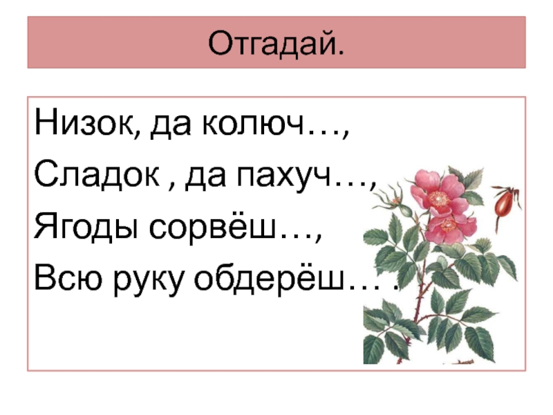 Отгадай.Низок, да колюч…,Сладок , да пахуч…,Ягоды сорвёш…,Всю руку обдерёш… .