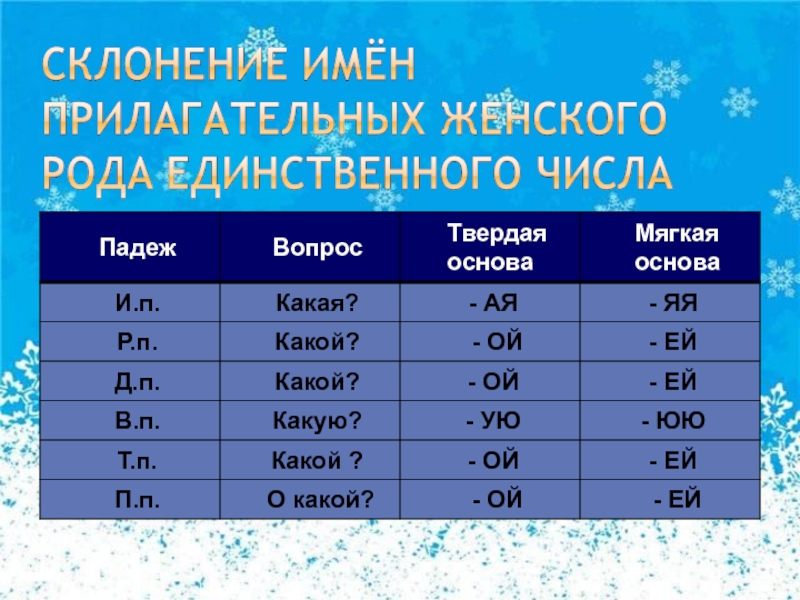 Тема: «Правописание падежных окончаний имен прилагательных женского рода»
