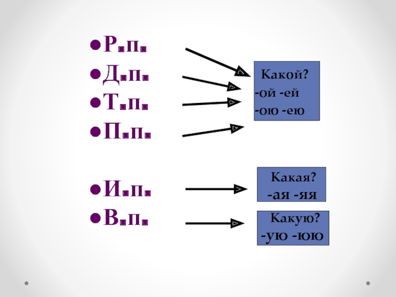 Р.п.Д.п.Т.п.П.п.И.п.В.п.-ой -ей-ою -ею-ая -яя-ую -ююКакой? Какая?Какую?