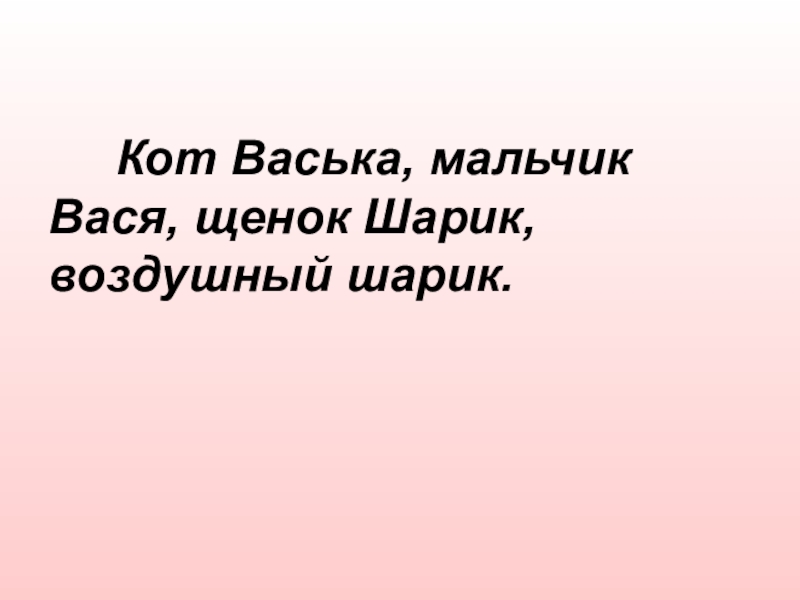 Слайд 15 Кот Васька, мальчик Вася, щенок Шарик, воздушный шарик.