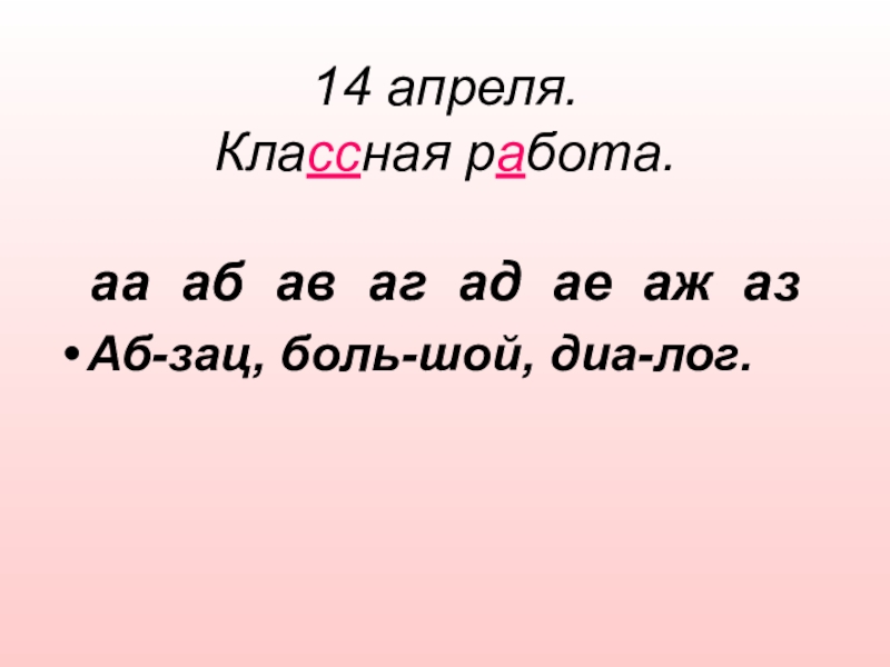 14 апреля. Классная работа.  аа аб ав аг ад ае аж аз  Аб-зац, боль-шой, диа-лог.