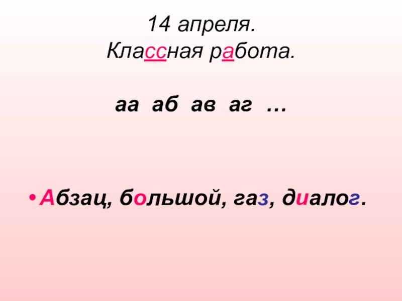 14 апреля. Классная работа. аа аб ав аг … Абзац, большой, газ, диалог.