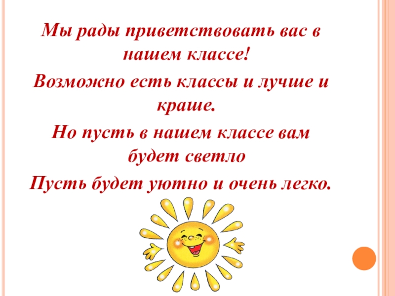Мы рады приветствовать вас в нашем классе!Возможно есть классы и лучше и краше.Но пусть в нашем классе вам будет светлоПусть будет уютно и очень легко.