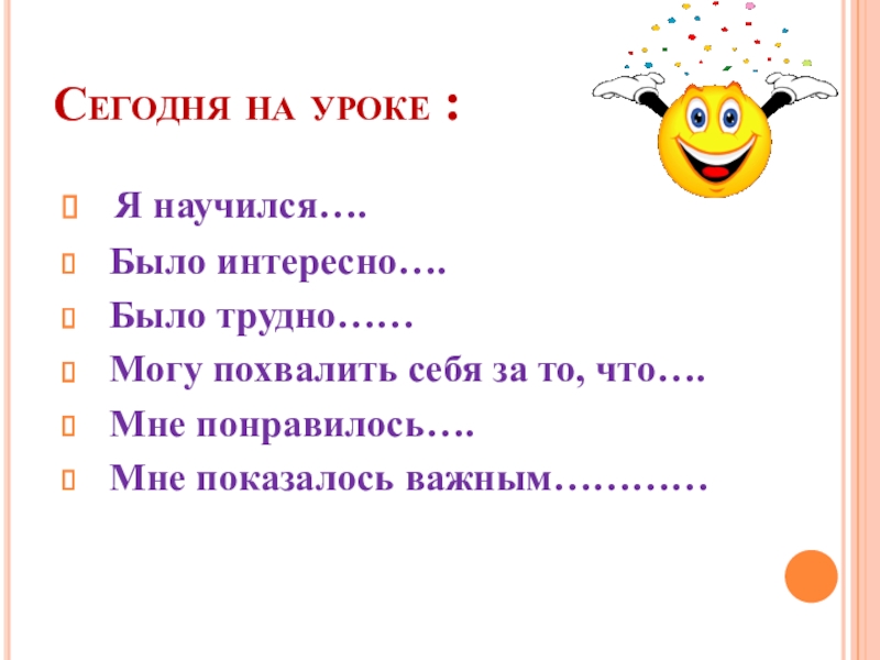 Сегодня на уроке : Я научился…. Было интересно…. Было трудно…… Могу похвалить себя за то, что…. Мне