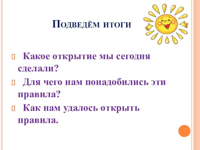 Подведём итоги Какое открытие мы сегодня сделали? Для чего нам понадобились эти правила? Как нам удалось открыть