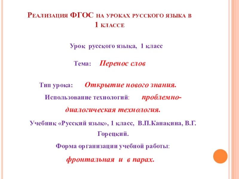 Урок русского языка в 1 классе « Перенос слов »
