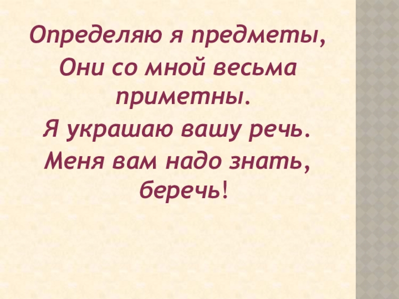 Определяю я предметы,Они со мной весьма приметны.Я украшаю вашу речь.Меня вам надо знать, беречь!
