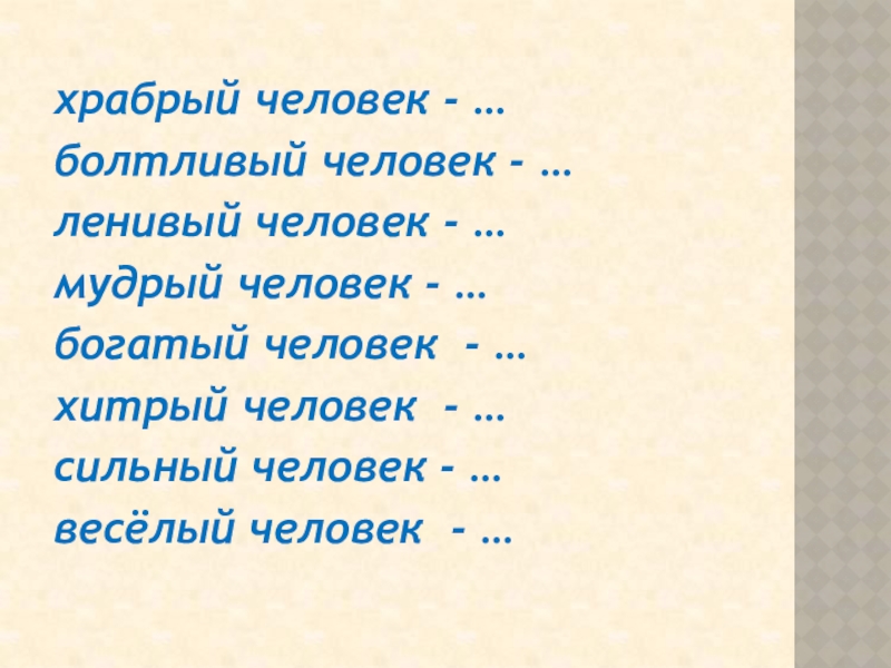 храбрый человек - … болтливый человек - … ленивый человек - …мудрый человек - … богатый человек