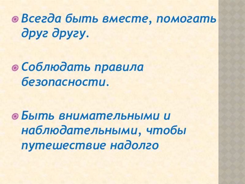 Всегда быть вместе, помогать друг другу. Соблюдать правила безопасности.Быть внимательными и наблюдательными, чтобы путешествие надолго
