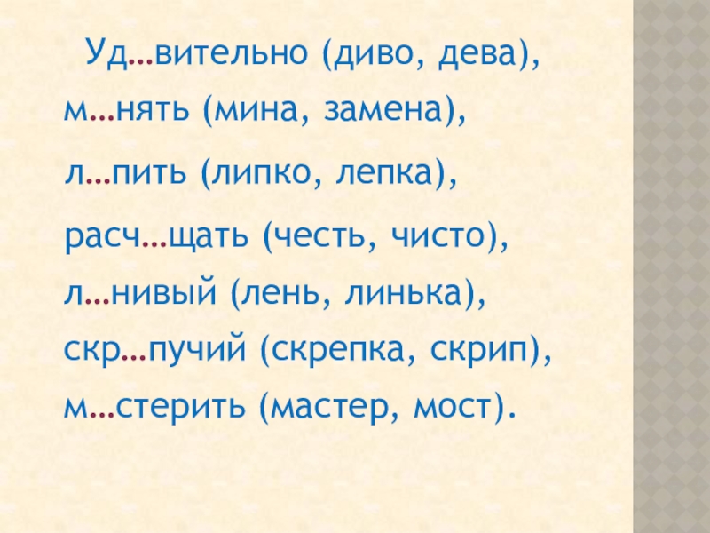 Уд…вительно (диво, дева), м…нять (мина, замена), л…пить (липко, лепка), расч…щать (честь, чисто), л…нивый (лень,