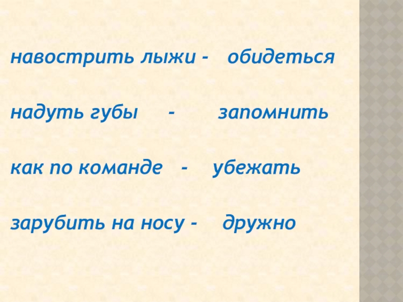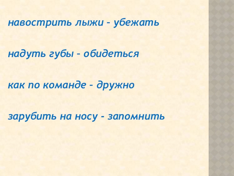 навострить лыжи – убежатьнадуть губы – обидетьсякак по команде – дружнозарубить на носу - запомнить