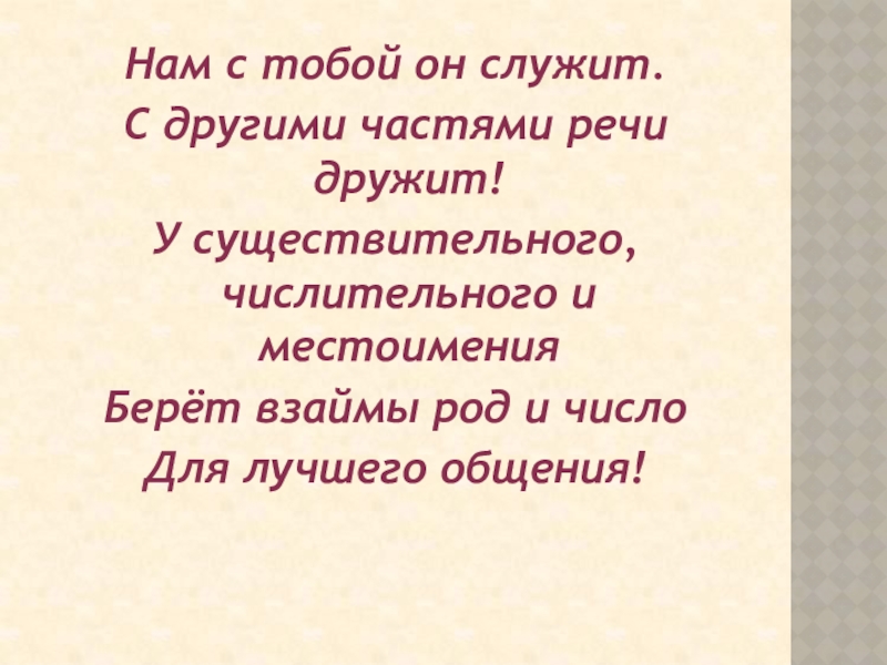 Нам с тобой он служит.С другими частями речи дружит!У существительного, числительного и местоимения Берёт взаймы род и