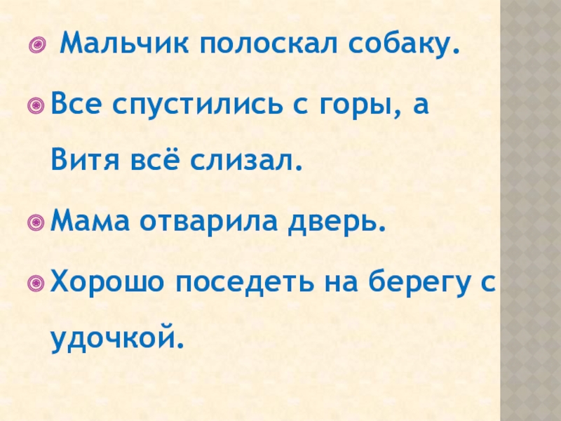 Мальчик полоскал собаку.Все спустились с горы, а Витя всё слизал.Мама отварила дверь.Хорошо поседеть на берегу с удочкой.