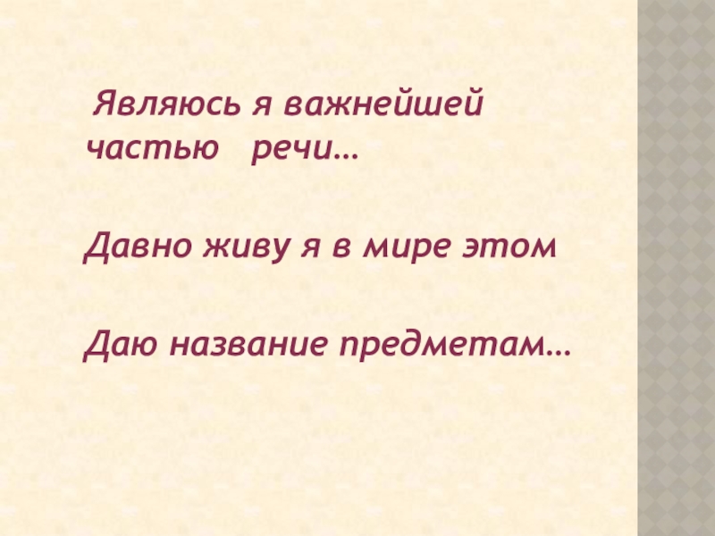 Являюсь я важнейшей частью  речи… Давно живу я в мире этом Даю название предметам…