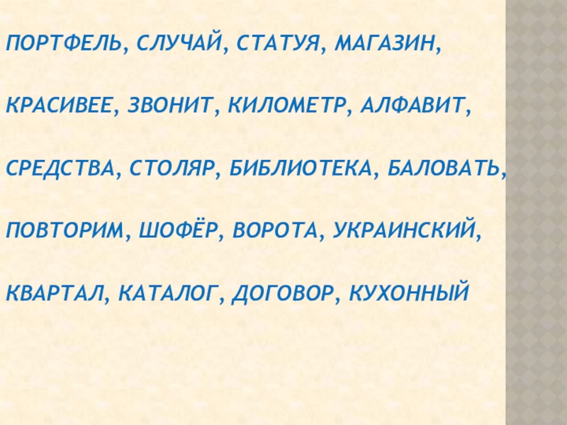 ПОРТФЕЛЬ, СЛУЧАЙ, СТАТУЯ, МАГАЗИН,  КРАСИВЕЕ, ЗВОНИТ, КИЛОМЕТР, АЛФАВИТ,  СРЕДСТВА, СТОЛЯР, БИБЛИОТЕКА, БАЛОВАТЬ, ПОВТОРИМ, ШОФЁР, ВОРОТА, УКРАИНСКИЙ, КВАРТАЛ, КАТАЛОГ,