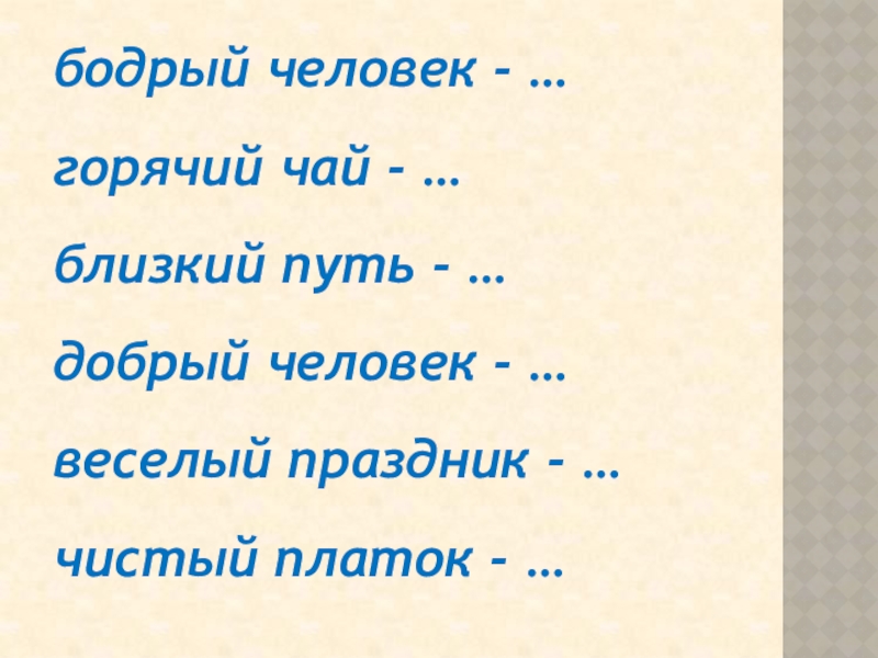бодрый человек - …горячий чай - …близкий путь - …добрый человек - …веселый праздник - …чистый платок