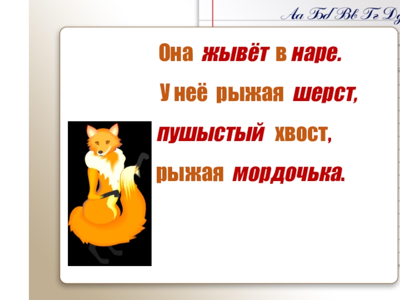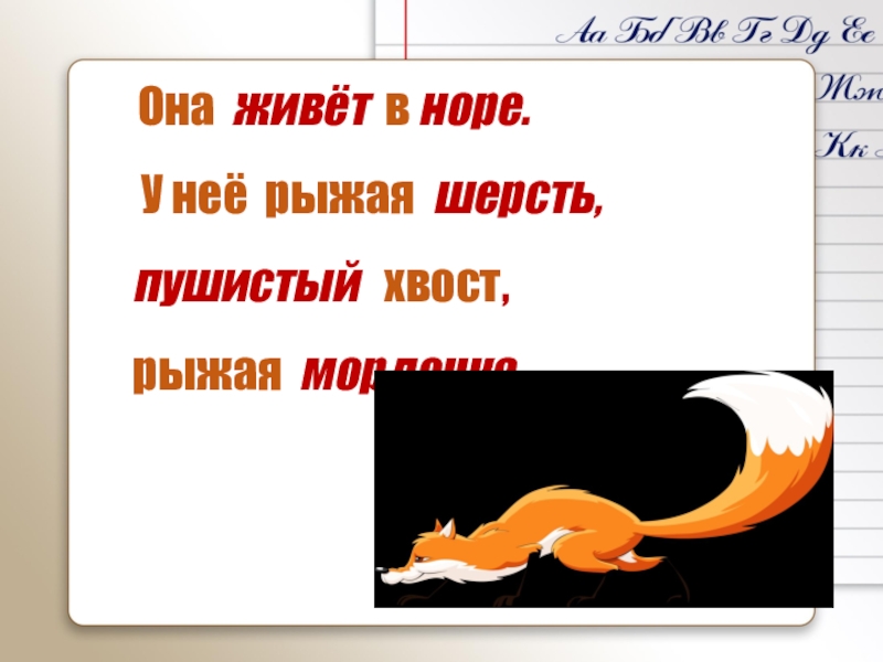 Она живёт в норе. У неё рыжая шерсть, пушистый  хвост, рыжая мордочка.