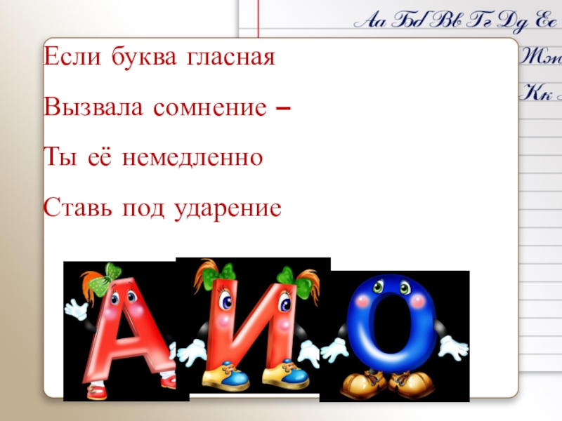 Если буква гласная 	Вызвала сомнение – Ты её немедленноСтавь под ударение