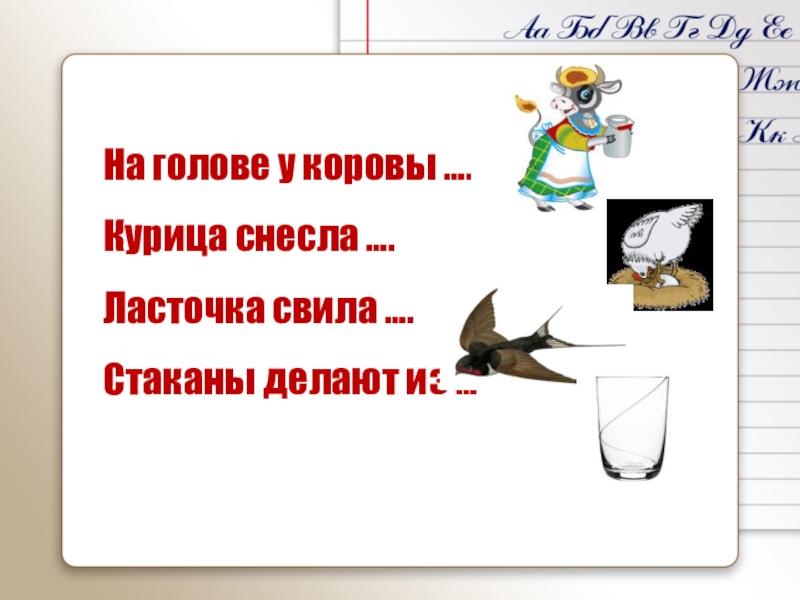 На голове у коровы ….Курица снесла ….Ласточка свила ….Стаканы делают из …