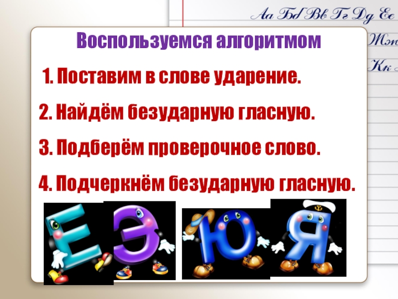 Воспользуемся алгоритмом 1. Поставим в слове ударение.2. Найдём безударную гласную.3. Подберём проверочное слово.4. Подчеркнём безударную гласную.