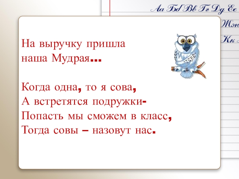 На выручку пришла наша Мудрая…Когда одна, то я сова,А встретятся подружки-Попасть мы сможем в класс,Тогда совы –