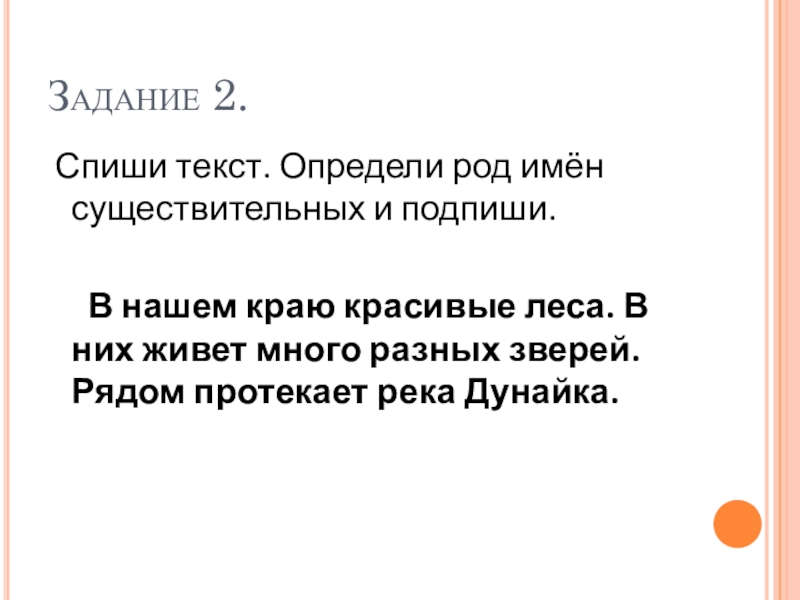 Задание 2. Спиши текст. Определи род имён существительных и подпиши.     В нашем краю