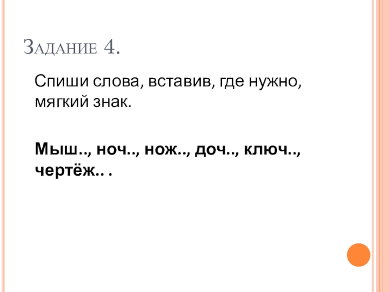 Задание 4.  Спиши слова, вставив, где нужно, мягкий знак.  Мыш.., ноч.., нож.., доч.., ключ.., чертёж..