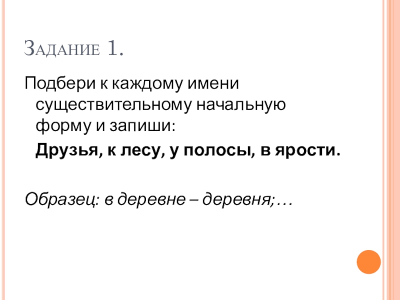 Задание 1.Подбери к каждому имени существительному начальную форму и запиши: Друзья, к лесу, у полосы, в ярости.Образец: в деревне – деревня;…