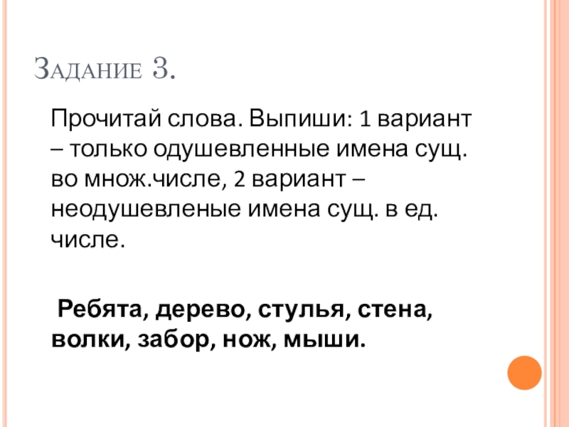 Задание 3.  Прочитай слова. Выпиши: 1 вариант – только одушевленные имена сущ. во множ.числе, 2 вариант