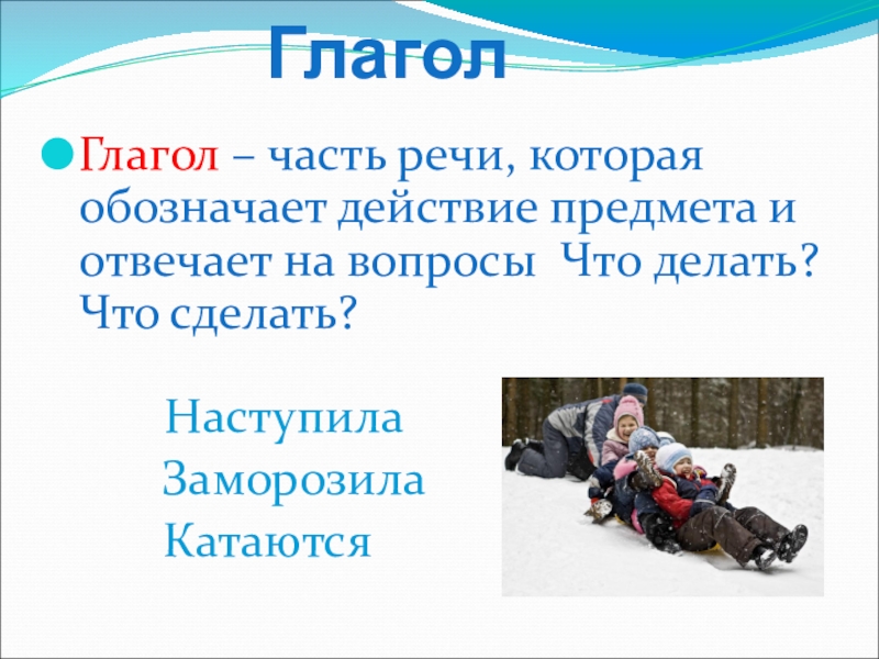 Глагол – часть речи, которая обозначает действие предмета и отвечает на вопросы Что делать? Что сделать?