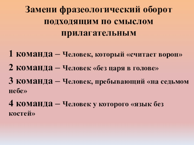 Замени фразеологический оборот подходящим по смыслом прилагательным