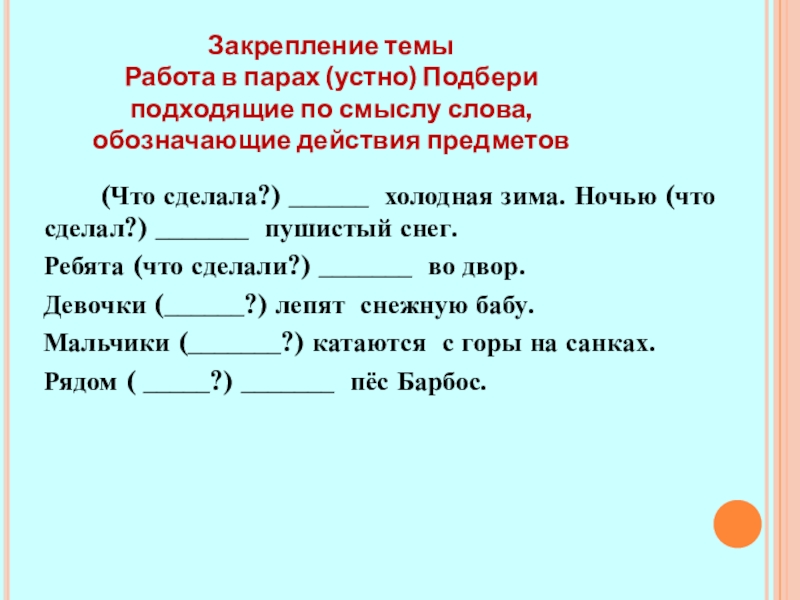Работа в парах (устно) Подбери подходящие по смыслу слова, обозначающие действия предметов