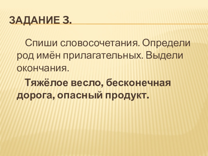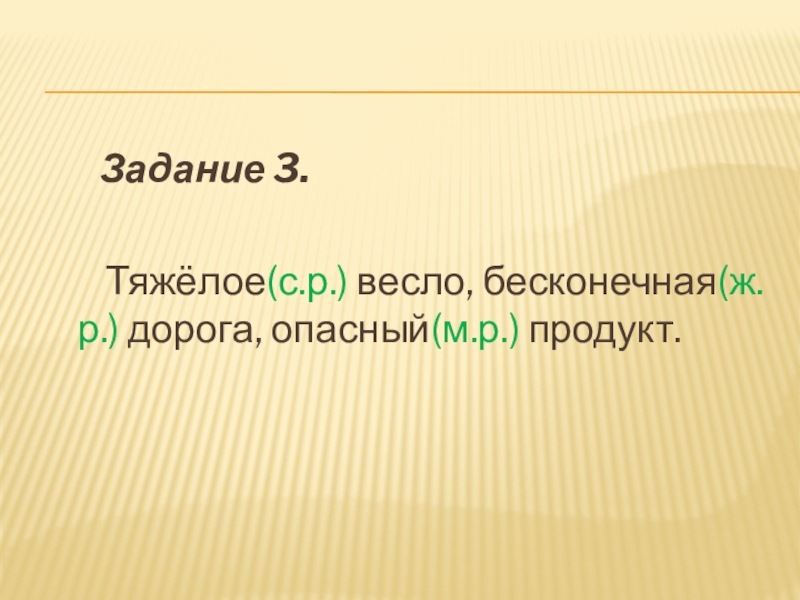 Задание 3.    Тяжёлое(с.р.) весло, бесконечная(ж.р.) дорога, опасный(м.р.) продукт.