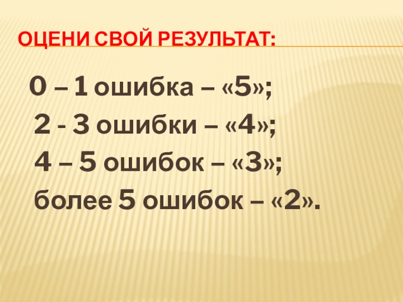 Оцени свой результат:  0 – 1 ошибка – «5»;  2 - 3 ошибки – «4»;