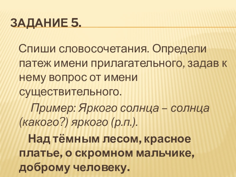 Задание 5.  Спиши словосочетания. Определи патеж имени прилагательного, задав к нему вопрос от имени существительного.
