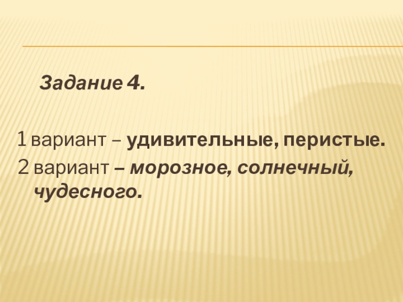 Задание 4.1 вариант – удивительные, перистые.2 вариант – морозное, солнечный, чудесного.