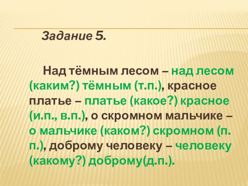 тёмным лесом – над лесом (каким?) тёмным (т.п.), красное платье – платье (какое?) красное (и.п., в.п.), о скромном мальчике – о мальчике (каком?) скромном (п.п.), доброму человеку – человеку (какому?) доброму(д.п.).