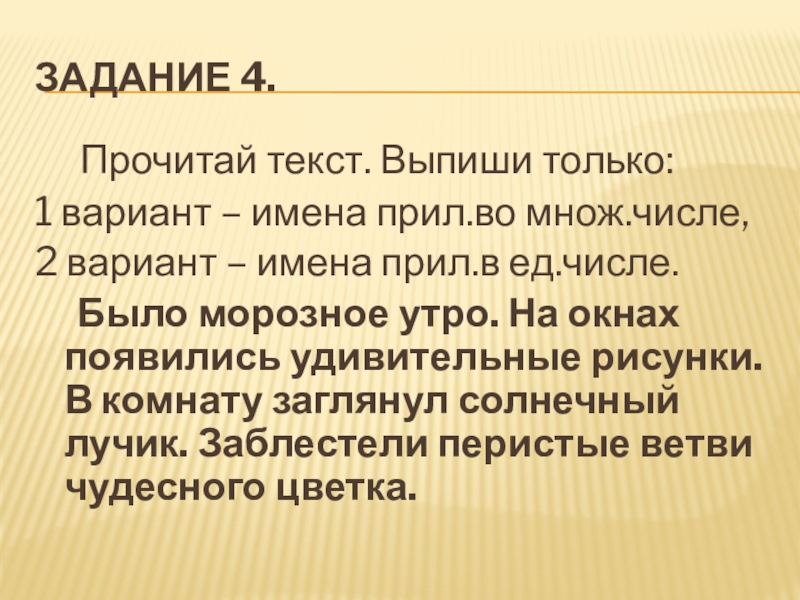 Задание 4.   Прочитай текст. Выпиши только:1 вариант – имена прил.во множ.числе,2 вариант – имена прил.в