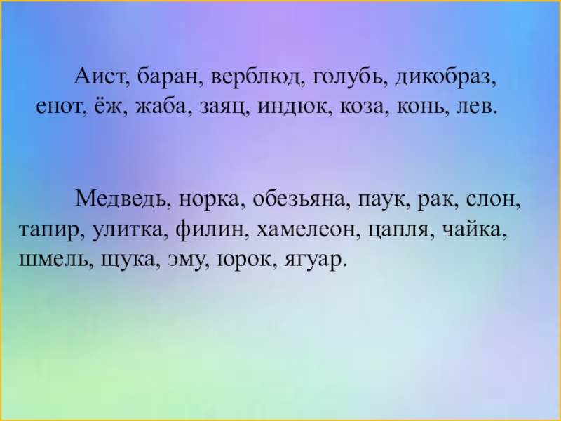 тапир, улитка, филин, хамелеон, цапля, чайка,
