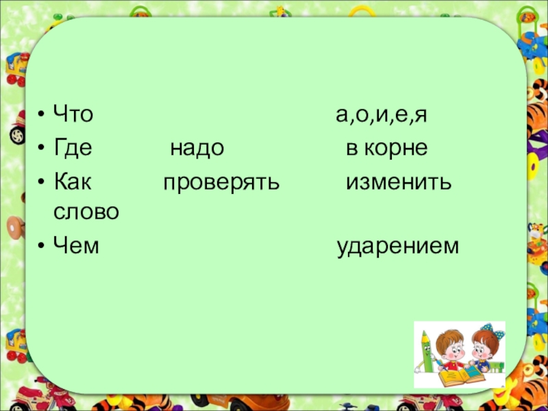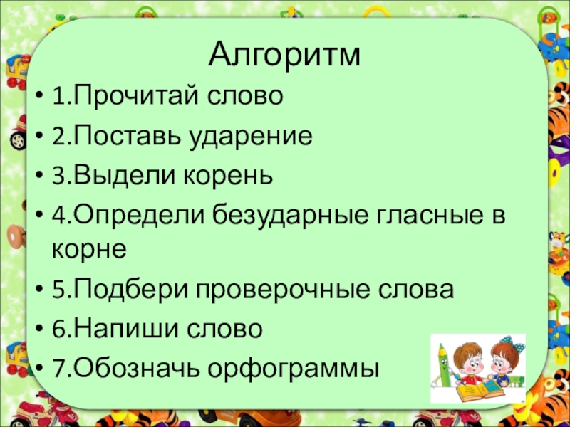 Алгоритм1.Прочитай слово2.Поставь ударение3.Выдели корень4.Определи безударные гласные в корне5.Подбери проверочные слова6.Напиши слово7.Обозначь орфограммы
