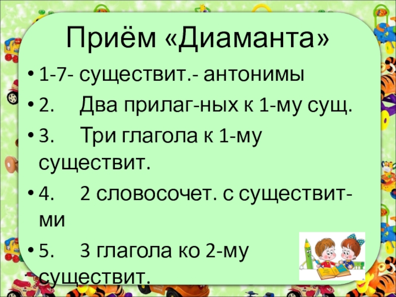 Приём «Диаманта»1-7- существит.- антонимы2.   Два прилаг-ных к 1-му сущ.3.   Три глагола к 1-му