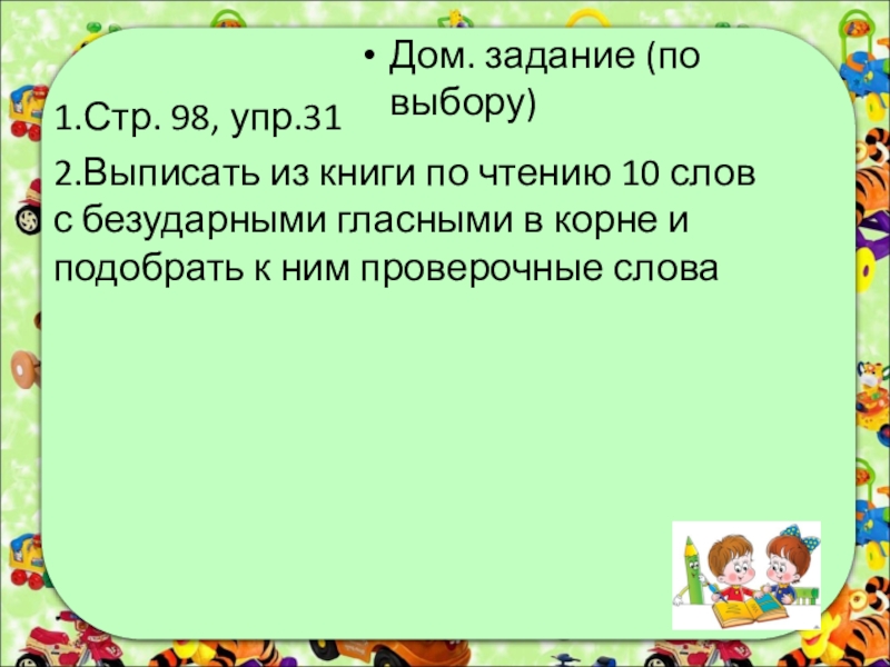 Дом. задание (по выбору)1.Стр. 98, упр.312.Выписать из книги по чтению 10 слов с безударными гласными в корне