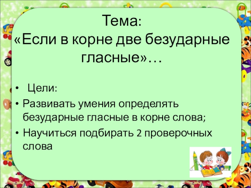 Тема: «Если в корне две безударные гласные»… Цели:Развивать умения определять безударные гласные в корне слова;Научиться подбирать 2