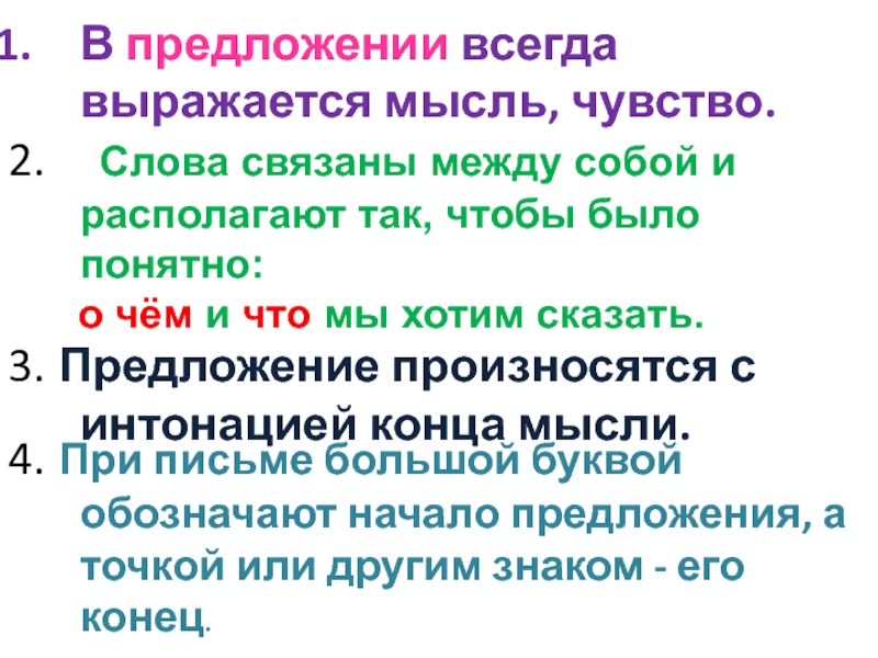4. При письме большой буквой обозначают начало предложения, а точкой или другим знаком - его конец.