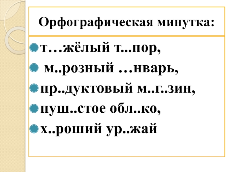 Орфографическая минутка:т…жёлый т...пор, м..розный …нварь, пр..дуктовый м..г..зин, пуш..стое обл..ко, х..роший ур..жай