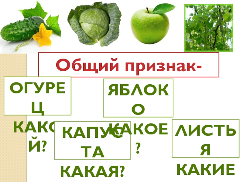 Общий признак- цветОгурецКакой?капустаКакая?яблокоКакое?листьяКакие?